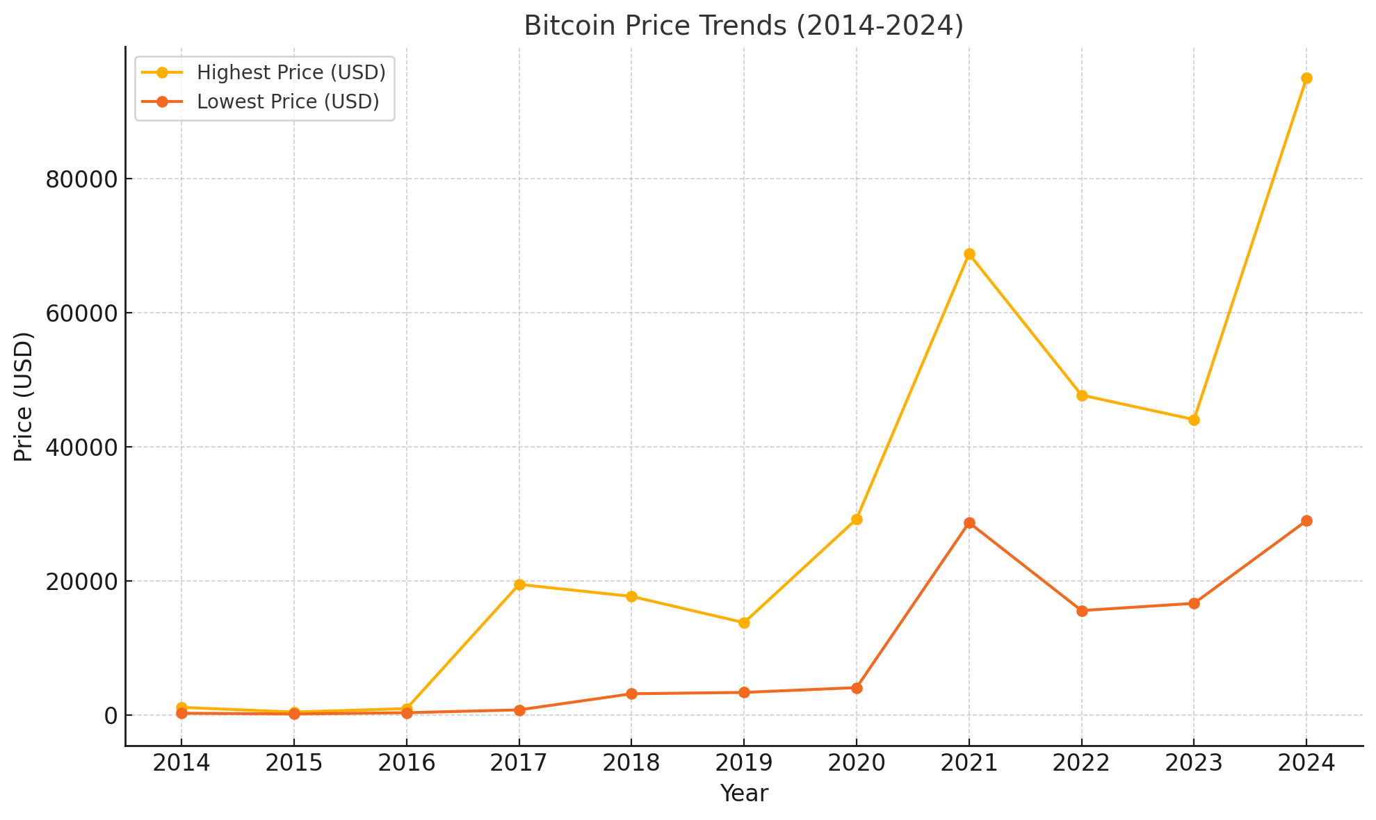 지난 10년간 비트코인 가격은 극심한 변동성을 보여주었습니다. 아래 표는 2014년부터 2024년까지 각 연도의 최고가와 최저가를 요약한 것입니다: