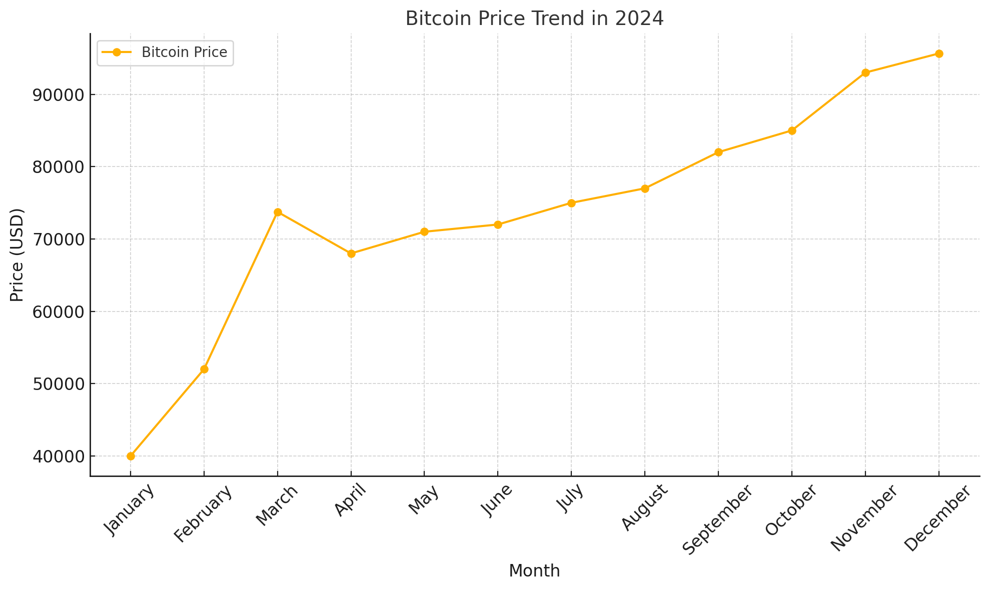 2024년 비트코인 가격은 반감기와 지정학적 사건 등 주요 이벤트에 영향을 받아 큰 변동성을 보였습니다. 1월에는 약 $40,000에서 시작하여 3월에 $73,750로 최고점을 기록했습니다. 12월 현재 가격은 $95,641로 연초 대비 크게 상승했습니다.